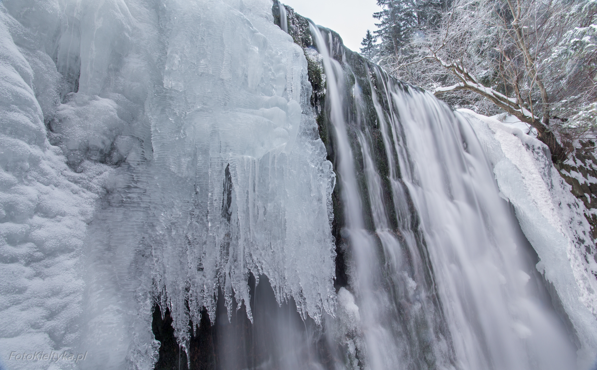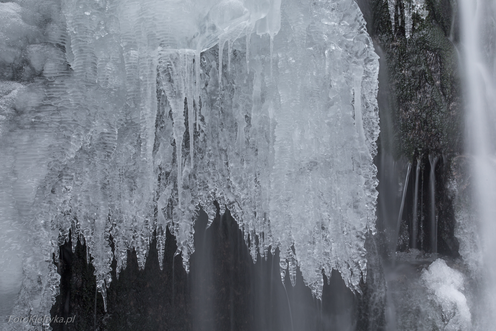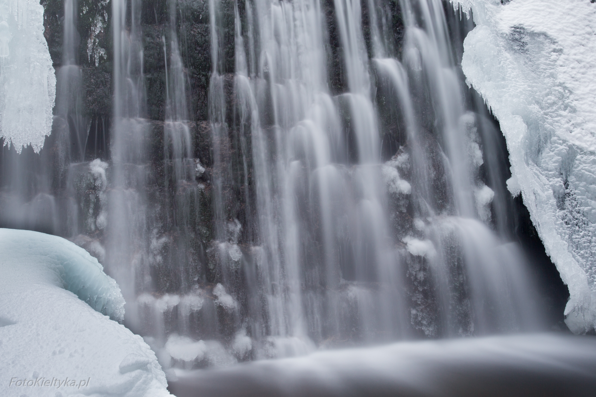 Galeria przedstawia Dziki Wodospad w Karpaczu uchwycony w zimowej odsłonie – o świcie, w pochmurny dzień, gdy natura milknie pod warstwą lodu. Fotograf ukazuje nie tylko urok zamarzniętych kaskad i lodowych sopli, ale też intymność chwili, w której był zupełnie sam w tej karkonoskiej scenerii. To opowieść o ciszy, świetle i surowym pięknie górskiego poranka. Tego dnia zmusiłem się żeby wstać wcześniej niż zwykle, ale było warto bo byłem w tej okolicy zupełnie sam. Spora część wodospadu była skuta lodem, który utworzył piękne sople.