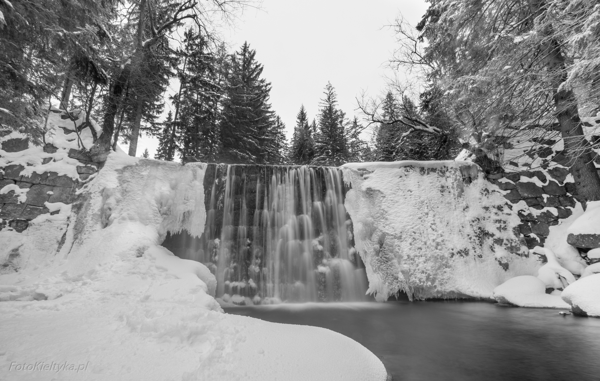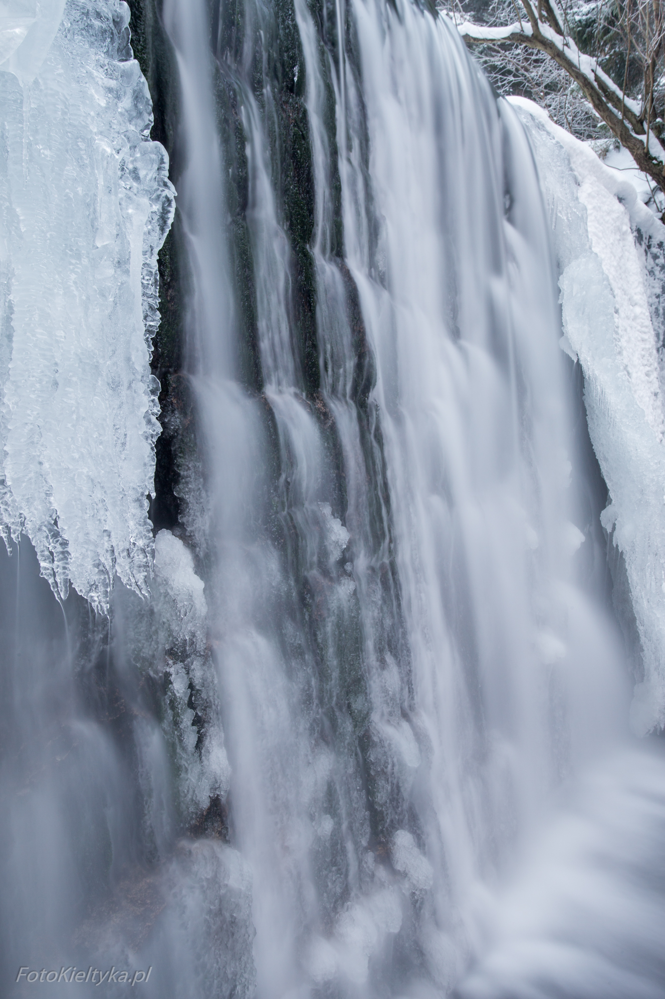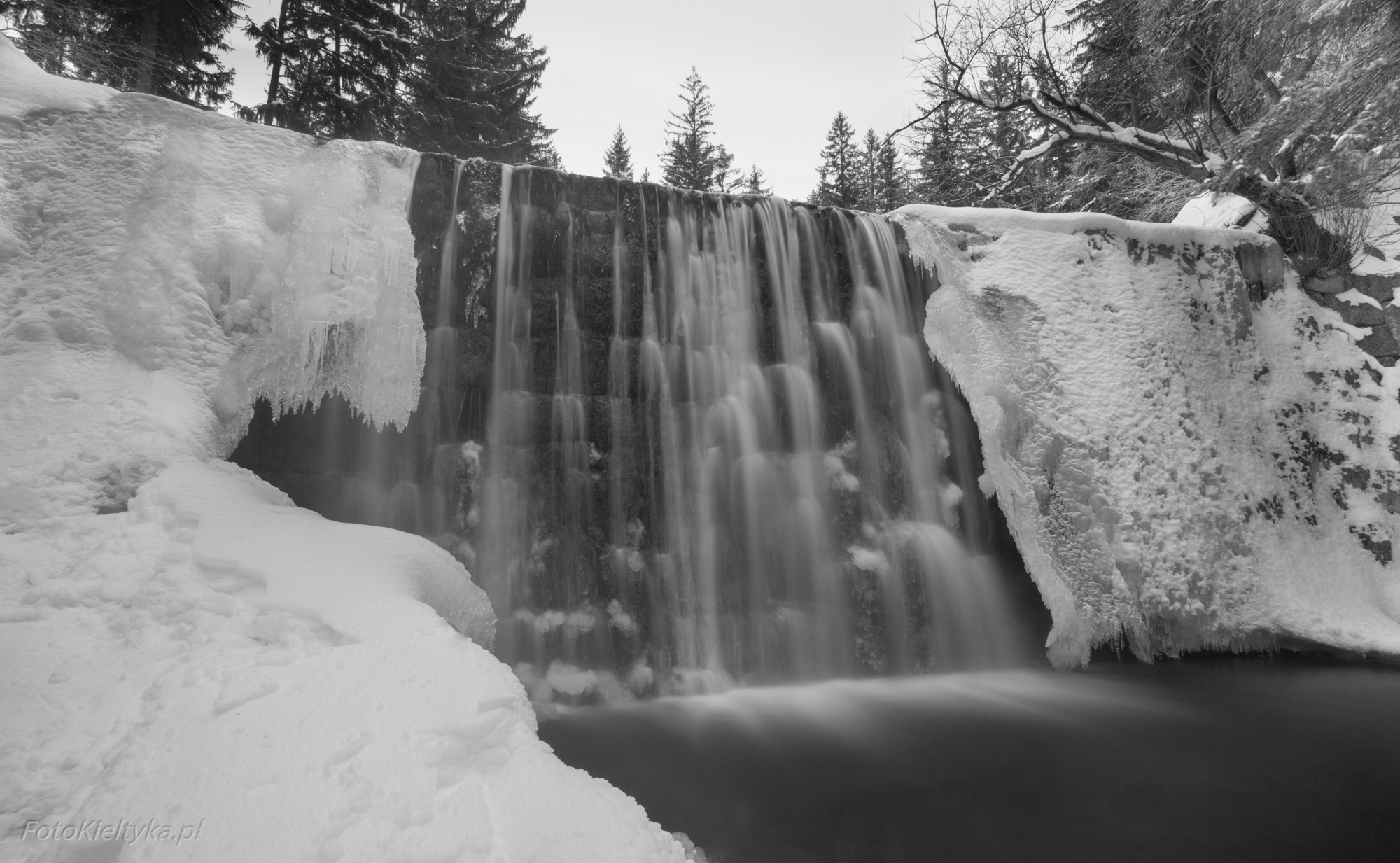 Galeria przedstawia Dziki Wodospad w Karpaczu uchwycony w zimowej odsłonie – o świcie, w pochmurny dzień, gdy natura milknie pod warstwą lodu. Fotograf ukazuje nie tylko urok zamarzniętych kaskad i lodowych sopli, ale też intymność chwili, w której był zupełnie sam w tej karkonoskiej scenerii. To opowieść o ciszy, świetle i surowym pięknie górskiego poranka. Tego dnia zmusiłem się żeby wstać wcześniej niż zwykle, ale było warto bo byłem w tej okolicy zupełnie sam. Spora część wodospadu była skuta lodem, który utworzył piękne sople.